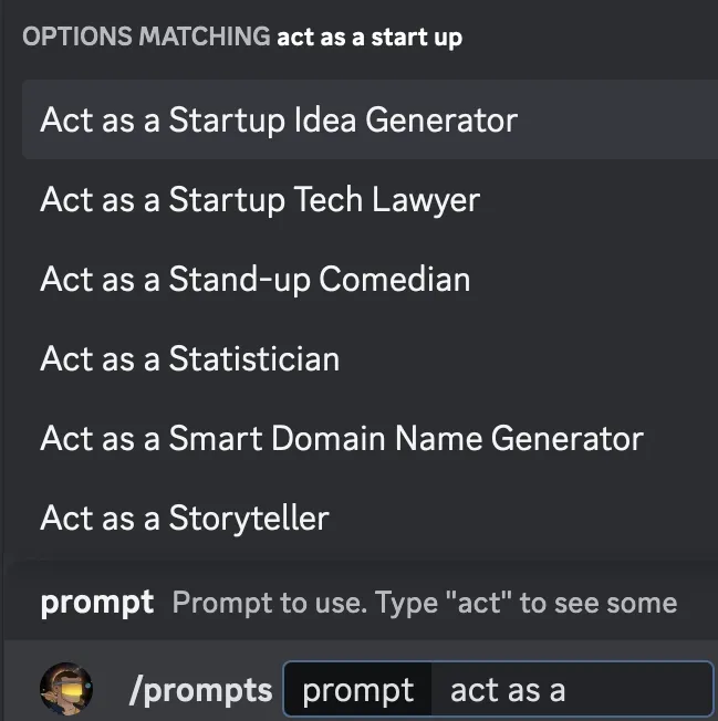 * [x] **(PREMIUM) /prompts\_list : Choose a category and then choose what you would like the bot to act as while specifically talking with you. Type /prompts to then search & use that prompt**