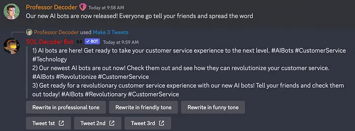<figure><img src="https://2420590043-files.gitbook.io/~/files/v0/b/gitbook-x-prod.appspot.com/o/spaces%2FXWzvj4XkfLBLdoEPhn3g%2Fuploads%2FHNQN9mVigKQSu96ty1i8%2F4dd.webp?alt=media&#x26;token=62a97971-b524-44eb-a12a-13ab9d9ffd14" alt=""><figcaption><p><em><strong>You can take any message or announcement and generate three example tweets using the bot. Once you have reviewed the tweets, you can click a button to post the desired tweet to your Twitter account.</strong></em></p></figcaption></figure>