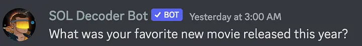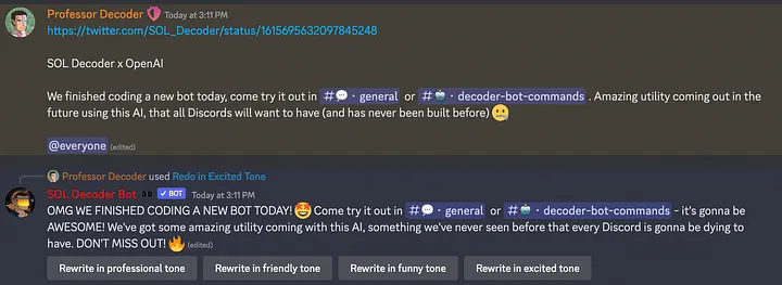 *Invite the bot today to chat with it for FREE (15 chats per day per user). Type /ai\_setup in your Discord and enter in your OpenAI key to increase the daily uses for free (or set it up on* [*https://apps.soldecoder.app/dao*](https://apps.soldecoder.app/dao)*). Type /ai\_features to learn more about the below as well.*