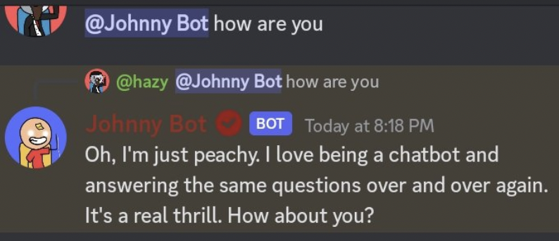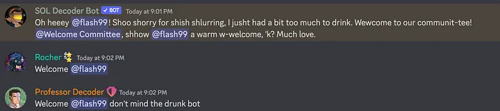 <figure><img src="https://2420590043-files.gitbook.io/~/files/v0/b/gitbook-x-prod.appspot.com/o/spaces%2FXWzvj4XkfLBLdoEPhn3g%2Fuploads%2FyVZbGlXNFJJG9tsb0Xc9%2F5dd.webp?alt=media&#x26;token=7361911b-71dd-4953-85d8-049c842cd1f1" alt=""><figcaption><p><em><strong>Create different types of welcome messages, including ones that are designed to make it seem like the bot is a drunk!</strong></em></p></figcaption></figure>